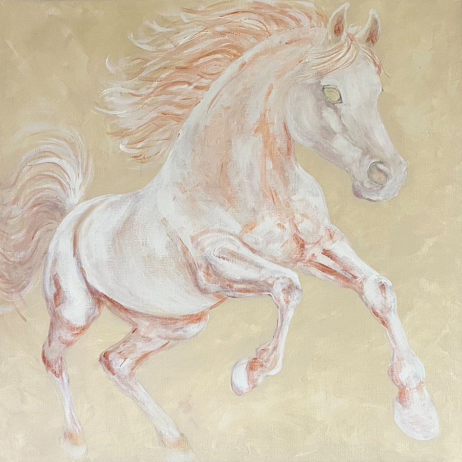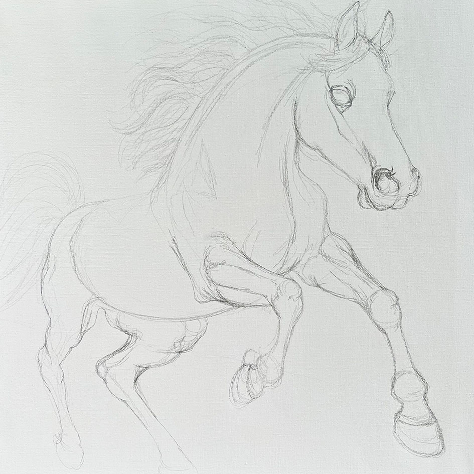 Zu Beginn wird das Pferd direkt auf die Leinwand gezeichnet. Mit lockeren Linien lege ich Proportionen, Haltung und Dynamik fest. Ziel ist es, die Energie und Bewegung des Pferdes von Anfang an einzufangen.
